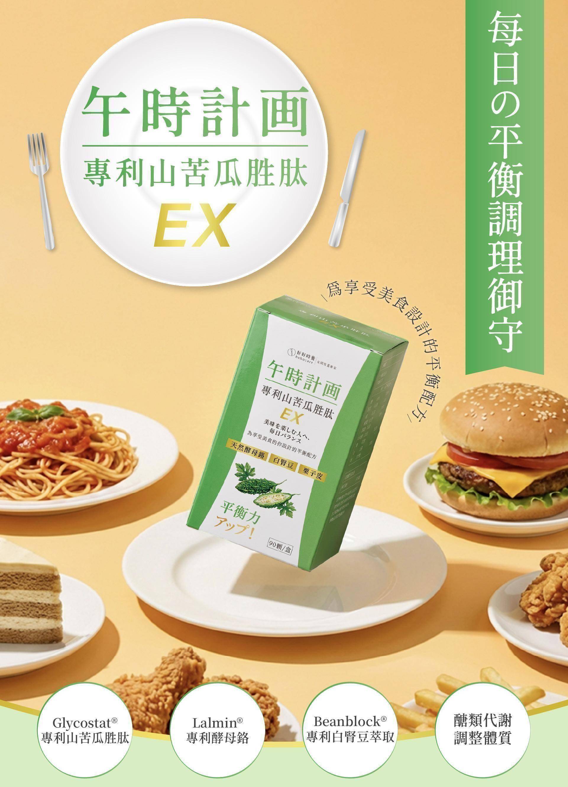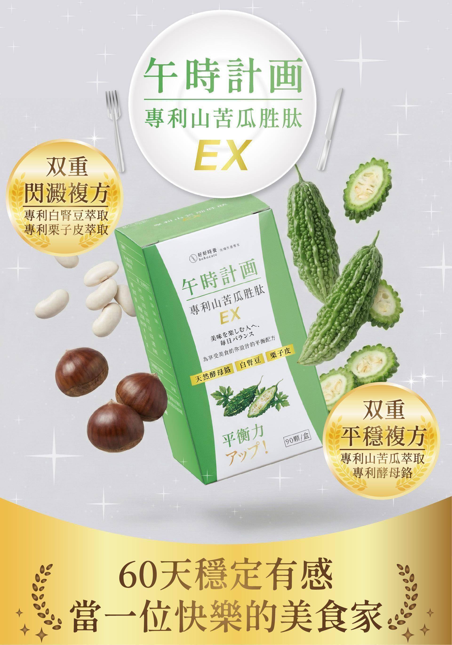 【午時計畫|專利山苦瓜胜肽 EX】不只是單一苦瓜萃取,而是選用美國專利山苦瓜胜肽(Glycostat®)作為核心,並以每日足量添加為設計前提,搭配專利白腎豆萃取、歐洲專利酵母鉻與專利栗子皮萃取,從多重面向協助維持醣類正常代謝、調整體質,打造更完整的日間平衡配方。