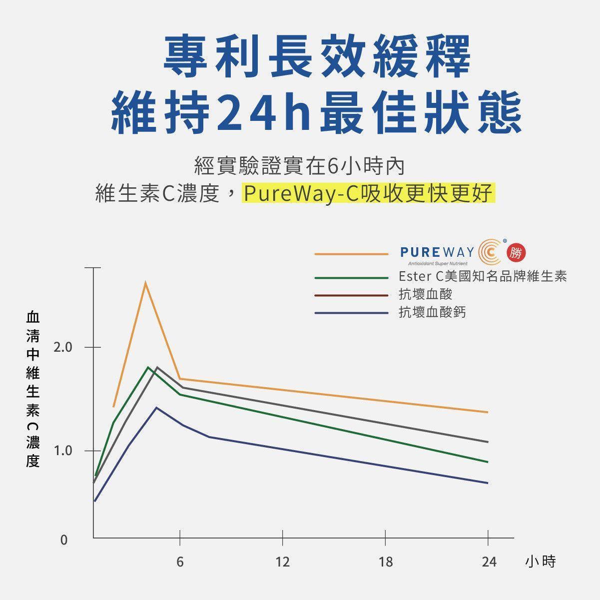 我們選用美國專利 Pureway®C 是市面上吸收率極高、且天然的維他命C之一,一點都不刺激。建議搭配餐後食用,溫和順口,敏感體質也可安心使用。