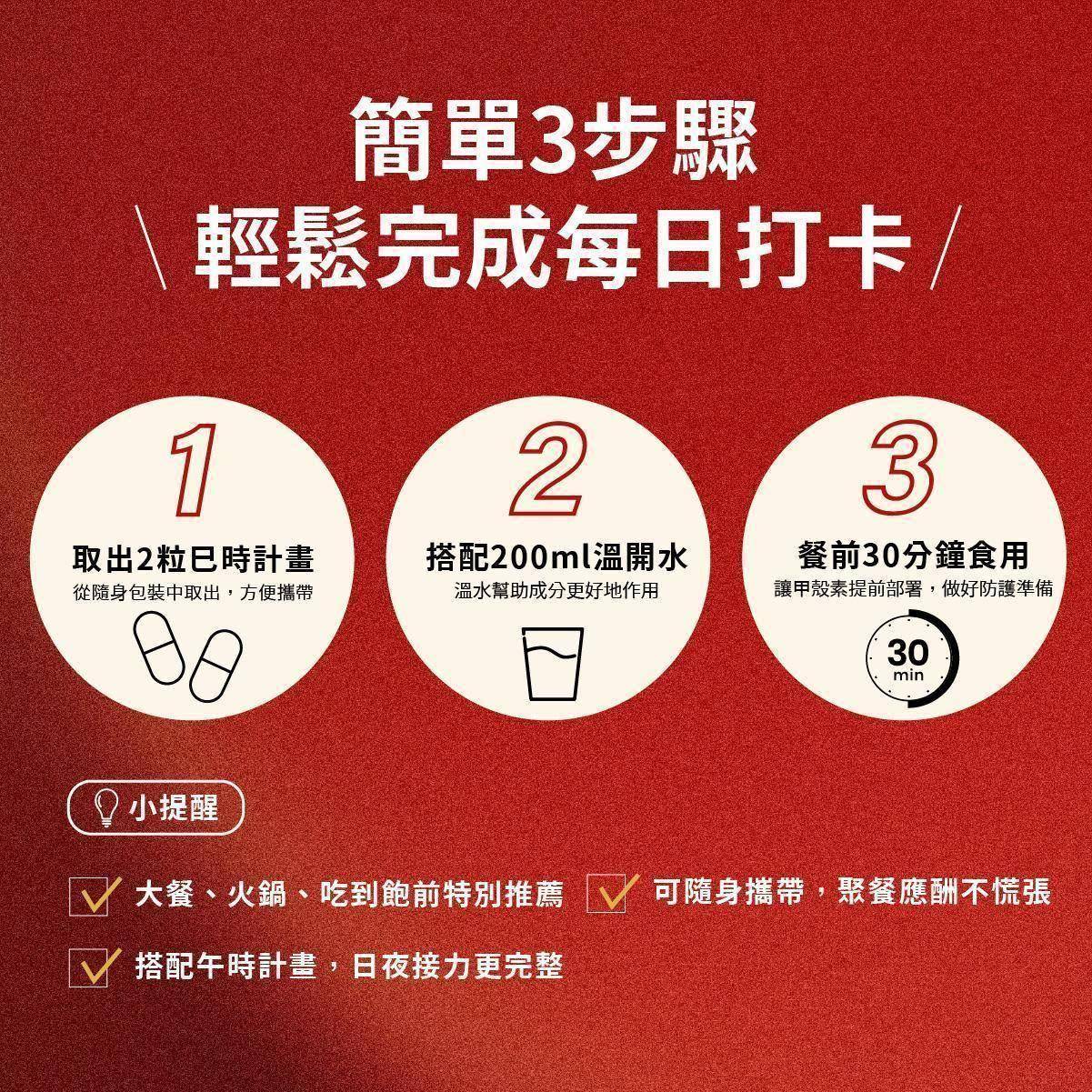 建議於每餐前 30 分鐘食用 1 顆,每日請勿超過 3 顆,多食無益。搭配 200ml 溫開水一起服用。